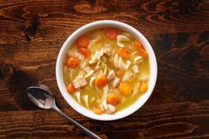 Chicken soup is loaded with nutrients that support the immune system: protein, vitamins C and K, several B vitamins, and water. Studies have shown that chicken noodle soup may help clear nasal congestion and ease cold symptoms.